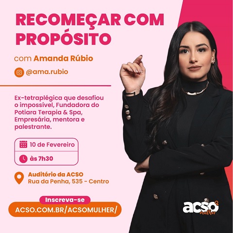 <p style="text-align: justify; "><span style="font-family: Arial;">O Conselho da Mulher Empreendedora e da Cultura (CMEC) inicia um novo capítulo de sua história e passa a se chamar ACSO Mulher. A mudança marca uma fase de fortalecimento institucional, alinhamento estratégico com a Associação Comercial e renovação do compromisso com o desenvolvimento, a capacitação e o protagonismo feminino no empreendedorismo e na cultura de Sorocaba e Votorantim.</span></p><p style="text-align: justify; "><span style="font-family: Arial;">Para celebrar esse recomeço, os encontros do grupo estão oficialmente de volta com o tema ‘Recomeçar com Propósito’, refletindo o momento vivido pela ACSO Mulher e pelas empreendedoras que fazem parte dessa rede. A proposta é inspirar, conectar e preparar mulheres para os desafios pessoais e profissionais, reforçando a importância do apoio mútuo e da construção coletiva.</span></p><p style="text-align: justify; "><span style="font-family: Arial;">A convidada especial desse primeiro encontro do ano será Amanda Rúbio, ex-tetraplégica que desafiou prognósticos médicos e transformou sua história num exemplo potente de superação. Hoje, Amanda é atleta de corrida, empresária e mentora, levando sua experiência de resiliência, disciplina e propósito a milhares de pessoas, especialmente mulheres que enfrentam desafios no empreendedorismo e na vida.</span></p><p style="text-align: justify; "><span style="font-family: Arial;">A trajetória de Amanda dialoga diretamente com a realidade das mulheres empreendedoras, que diariamente precisam se reinventar, superar obstáculos e manter o foco mesmo diante das adversidades. Sua palestra promete provocar reflexões profundas sobre propósito, coragem e a capacidade de recomeçar, valores essenciais para quem empreende e lidera.</span></p><p style="text-align: justify; "><span style="font-family: Arial;">Segundo a coordenadora da ACSO Mulher, Laura Brugnerotto, o momento simboliza mais do que uma mudança de nome. “A ACSO Mulher nasce com ainda mais força e representatividade. Recomeçar com propósito é entender que nossas histórias, desafios e conquistas nos preparam para voos maiores. Ter a Amanda conosco é um presente e uma inspiração para todas as mulheres que desejam transformar suas realidades”.</span></p><p style="text-align: justify; "><span style="font-family: Arial;">O evento acontece no dia 10 de fevereiro, às 7h30, no auditório da ACSO, localizado na Rua da Penha, 535, Centro de Sorocaba. A participação é gratuita para associadas e as inscrições devem ser realizadas pelo link www.acso.com.br/ACSOMulher/. A ACSO Mulher convida todas as interessadas a fazer parte deste novo ciclo, juntas, mais fortes e preparadas.</span></p>