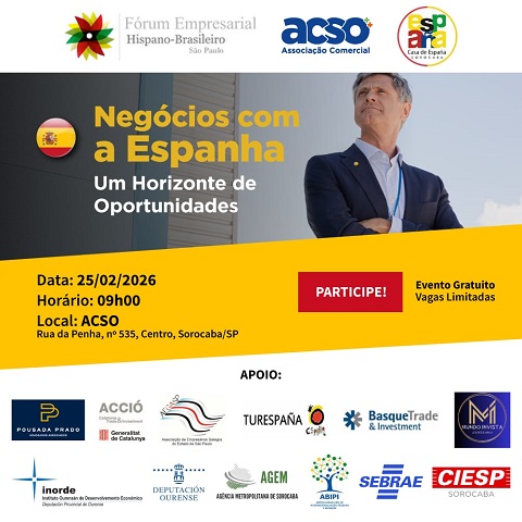 <p style="text-align: justify; "><span style="font-family: Arial;">A ACSO, em parceria com o Fórum Empresarial Hispano-Brasileiro (FEHB) e a Casa de España ‘Don Felipe II’, promove, no dia 25 de fevereiro (quarta-feira), o evento ‘Negócios com a Espanha – Um Horizonte de Oportunidades’. O encontro será realizado no auditório da Associação Comercial, localizada na Rua da Penha, 535, no Centro de Sorocaba, e é gratuito, com vagas limitadas mediante inscrição prévia pelo link www.acso.com.br/Inscricao/.</span></p><p style="text-align: justify; "><span style="font-family: Arial;">A iniciativa tem como objetivo apresentar às empresas da Região Metropolitana de Sorocaba (RMS) as vantagens econômicas e geográficas das comunidades autonômicas espanholas, além dos apoios e incentivos oferecidos a empresários brasileiros interessados em internacionalização. A proposta é destacar a Espanha como destino estratégico e porta de entrada para o mercado europeu, ampliando horizontes e conexões comerciais. </span><span style="font-family: Arial;">Entre os destaques está a presença do cônsul-geral da Espanha em São Paulo, D. Pablo Montesino-Espartero Velasco, que participará do encerramento do encontro. O evento também contará com a participação de autoridades locais e especialistas em comércio exterior, reforçando o ambiente institucional e estratégico da iniciativa.</span></p><p style="text-align: justify; "><span style="font-family: Arial;">A programação terá início às 8h30, com welcome coffee, seguido da abertura oficial da ACSO, Prefeitura e Câmara Municipal de Sorocaba. Ao longo da manhã, representantes de entidades como ACCIÓ Catalunya, Basque Trade & Investment, Turespaña, Inorde/Deputación de Ourense e ABIPI apresentarão oportunidades de negócios, aspectos legais para abertura de empresas na Espanha, incentivos regionais e iniciativas de fomento à internacionalização.</span></p><p style="text-align: justify; "><span style="font-family: Arial;">Para o vice-presidente da ACSO, Nilton Cezar, o evento representa uma oportunidade única para o empresariado local. “Estamos trazendo a Sorocaba representantes oficiais de importantes regiões e, especialmente, o cônsul-geral da Espanha. É uma ocasião estratégica para que nossos empresários conheçam caminhos concretos de internacionalização, ampliem sua visão de mercado e estabeleçam contatos diretos com instituições que podem apoiar seus projetos na Europa”.</span></p><p style="text-align: justify; "><span style="font-family: Arial;">Ao final das palestras, haverá espaço para perguntas, respostas e networking entre representantes institucionais e especialistas. “A expectativa é reunir empresários, empreendedores e lideranças interessados em expandir seus negócios e explorar novas oportunidades no mercado europeu”, destaca D. Felipe Pousada Prado, presidente do FEHB.</span></p>